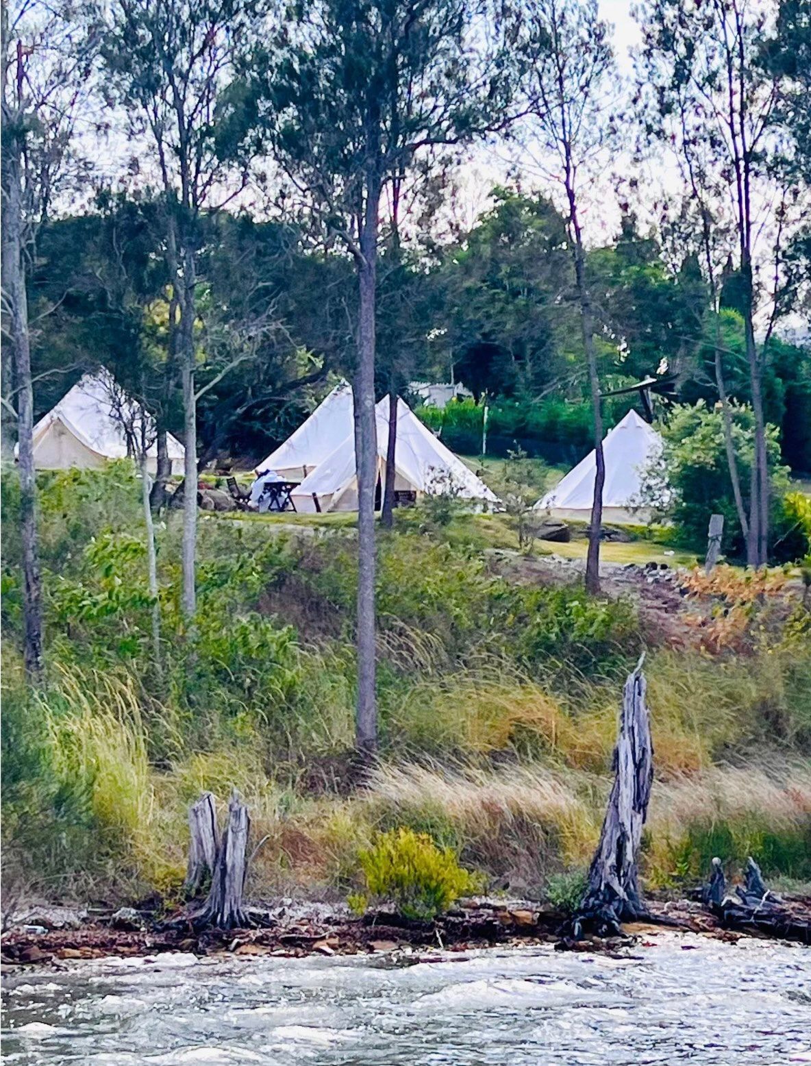 The luxury tents are situated on the waterfront. They include a king bed or x2 singles, luxury linen, rug, fan, bed side tables, bedside lamps, bar fridge, power, picnic table and chairs, BBQ, barrel sauna, organic garden etc.