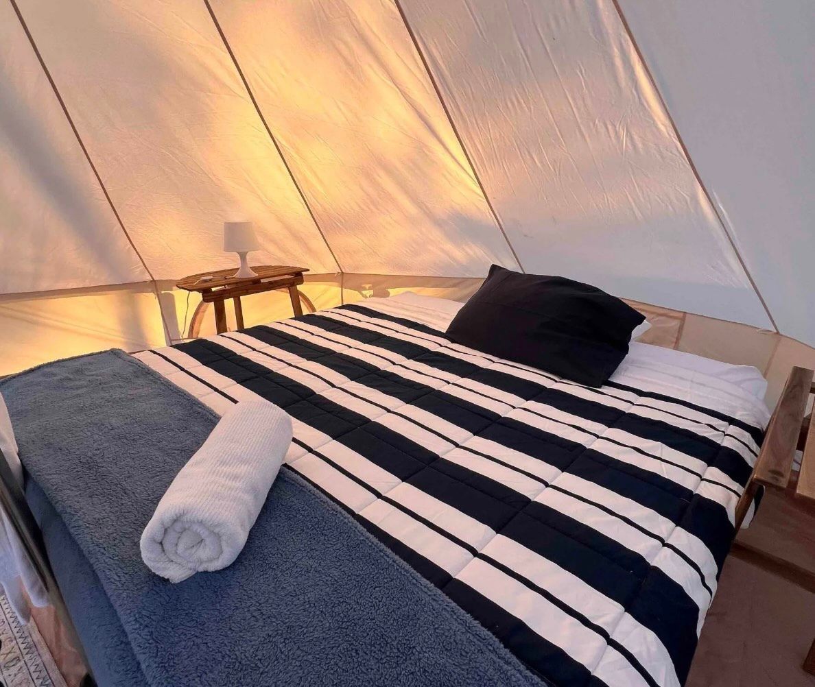 x 4 Luxury 5m glamping Bell Tents. Each tent has a king or x2 single beds, luxury linen, furniture, power, fan, rug, bar fridge, bed side lights, picnic table, chairs and a BBQ area.