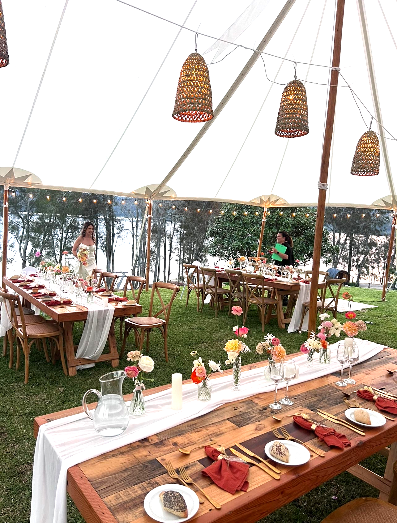 We are excited to announce that all weddings above 26 guests at The Moorings Lakehouse will now have a gorgeous Sailcloth marquee tent as their reception venue. The marquee is included in the wedding package along with all timber tables, chairs, lighting, arbour etc. The Marquee is set up on the exquisite lake view lawn in front of the Rainbow Room. The location has 270 degree water views and a rolling lawn down to our private jetty. The marquee connects to the Rainbow Room which has a timber bar, hardwood dance floor and bathroom.